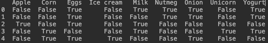 배열을 출력해 보면 다음과 같이 확인 할 수 있습니다. 즉, 이 과정을 거치면 (Apple, Corn, Eggs, Ice cream, Milk, Nutmeg, Onion, Unicorn, Yogurt) 을 컬럼으로 갖고 아이템의 유무에 따라 True, false로 표현 된 배열을 갖게 됩니다.