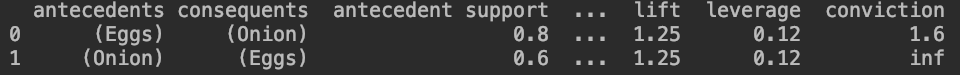 association_rules 함수를 이용하여 지지도가 0.5가 넘는 항목에 대해 향상도가 양의 상관관계에 있는 것이 무엇인지 알아봅시다.