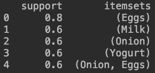 frequent_itemsets = apriori(df, min_support=0.5, use_colnames=True)